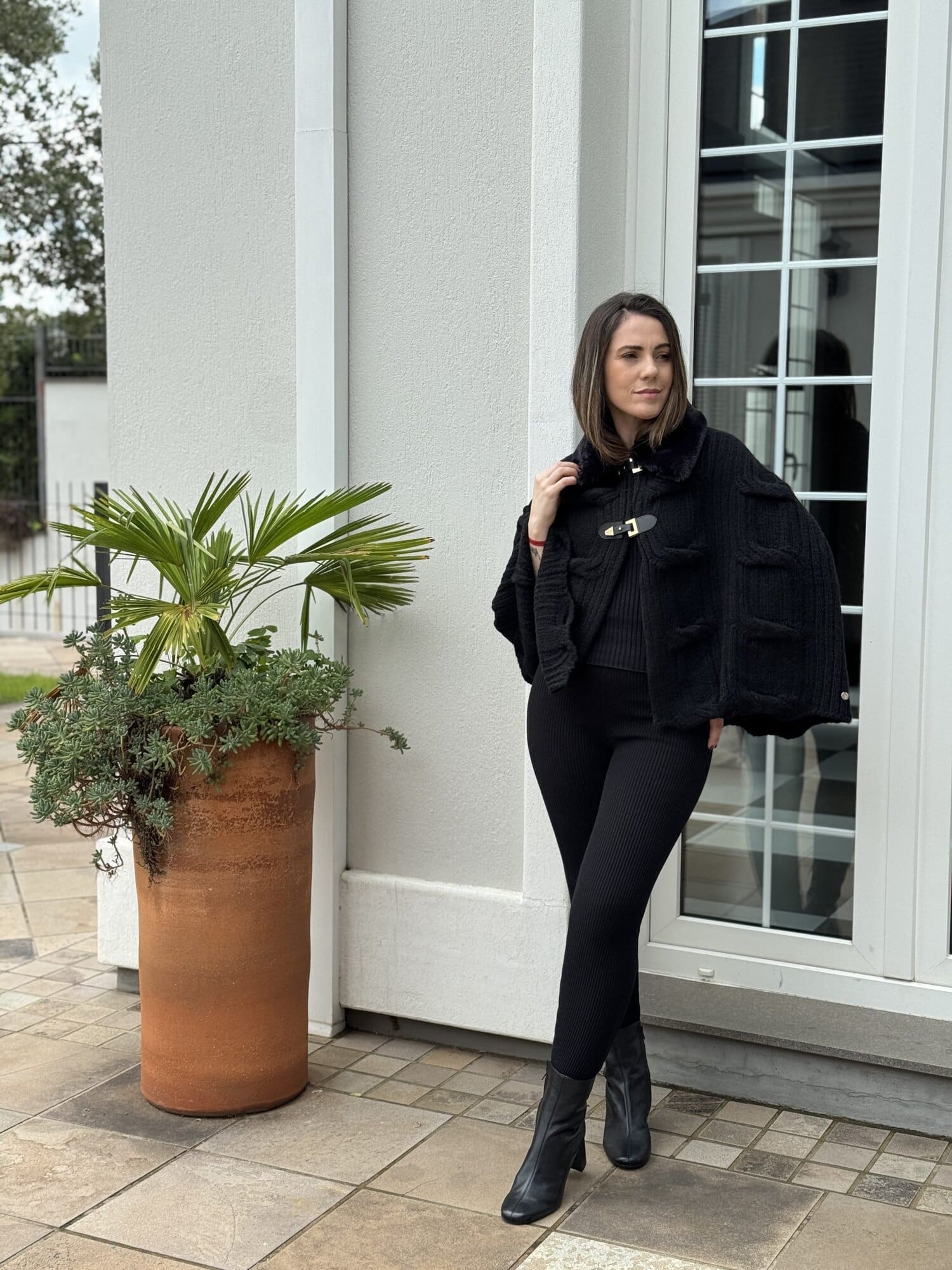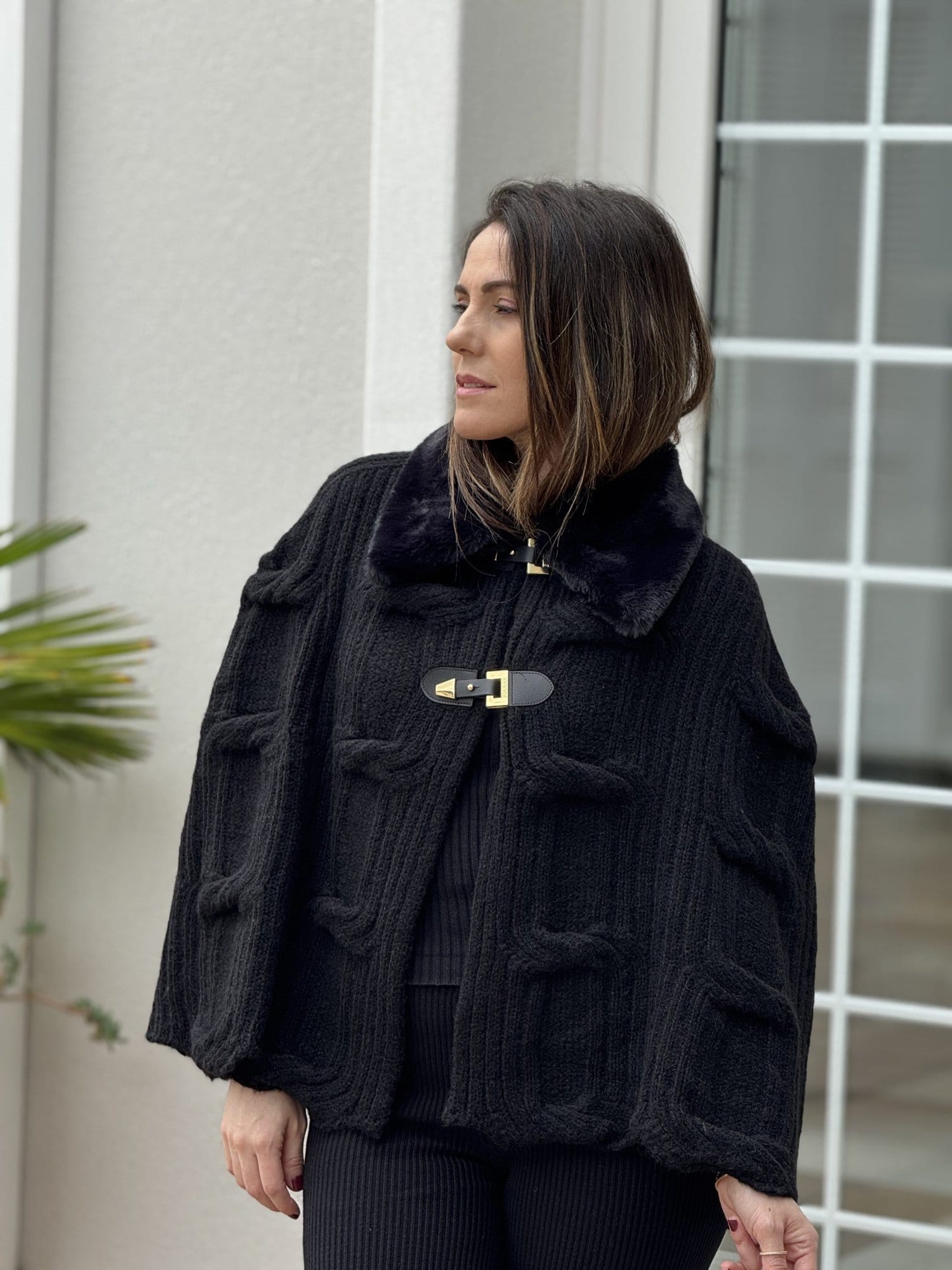 Capa Biamar Feminina Curta em Ponto Corrente e Gola de Pele Fake Preta