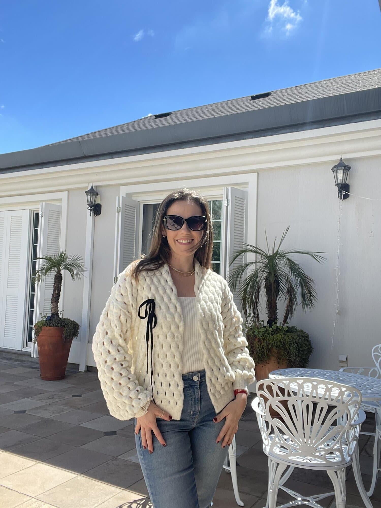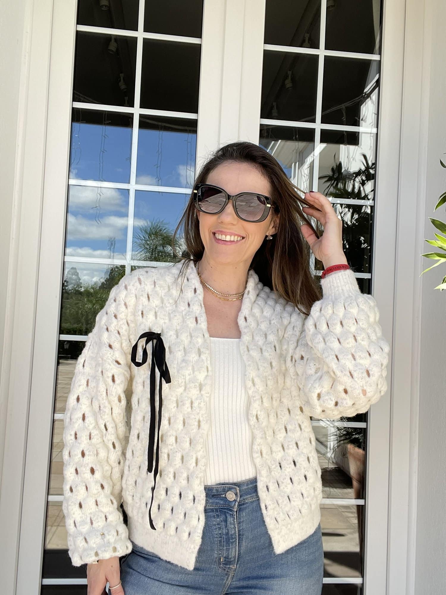 Casaco Biamar Feminino Curto em Ponto Colmeia com Laço Removível Branco